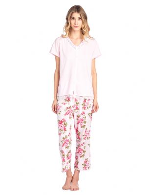 Soft and lightweight Knit Button Front Short Sleeve Pajamas 2-piece Sleep Set in a fun feminine Floral pattern print, beautiful enough for special occasions, yet comfortable enough for every day. Capri Length Pants with a drawstring waist for easy pull on and added comfort, Pjs top Features Short Sleeves, 5 Button closure, lace and Satin Ribbon Trim details, V-Neck and embroidered flowers. A comfortable fit sleepwear that is perfect for sleeping or lounge around.