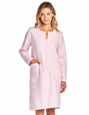 This cozy warm Zipper Front Fleece Robe from Casual Nights, Exceptionally lightweight bathrobe made from poly fleece smooth to the touch fabric. Housecoat features; Long sleeves, stitching detail, flower embroidery appliques, front zip closure measures 28" inches makes the shower robe easy to wear. Measures approx. 39" from shoulder to hem. Perfect for spas, shower houses, dorms, pools, gyms, bathrooms, lounging, changing and more. Excellent Gift Idea.