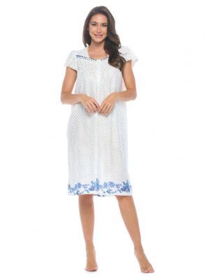 Casual Nights Women's Botanic Lace Short Sleeve Nightgown - Dot/Blue - Size recommendation: Size Medium (4-6) Large (8-10) X-Large (12-14) XX-Large (16-18), Order one size up For a more Relaxed FitHit the sack in total comfort with this Soft and lightweight Knit Nightgown in a fun floral pattern. Nightshirt features: 5 Button closure, square neck, short sleeves, detailed with lace and Smocking for an extra feminine touch. Approximately 40" from shoulder to hem. A comfortable fit perfect for sleeping or lounging around.