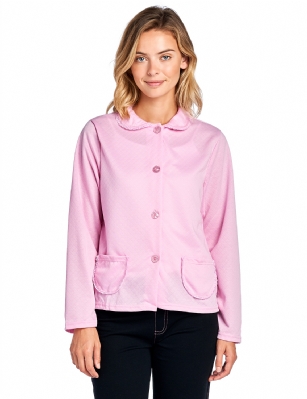 This Button Up Front Quilted Bed Top from Casual Nights, Exceptionally lightweight made from poly smooth to the touch fabric. Jacket features; Long sleeves, quilted design, Fancy lace trim detail at round collar and pockets, patch pockets, front easy 5 button closure measures 25-26" inches makes the shower robe easy to wear. Measures approx. 39" from shoulder to hem. Perfect for spas, shower houses, dorms, pools, gyms, bathrooms, lounging, changing and more. Great Gift Idea.