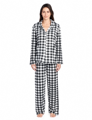 Casual Nights Women's Long Sleeve Rayon Button Down Pajama Set - Black Plaid