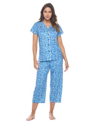 Casual Nights Women's Rayon Printed Short Sleeve Capri Pajama Set - Blue - Soft and lightweight Rayon Knit Pajamas in a fun prints and patterns, coziest pajamas you'll ever own. Features Button down closure with notch collar, matching easy pull on pajama pants with elastic waistband for added comfort, These pj's offer comfortable straight fit perfect for sleeping or curling up on the couch to watch a movie.Please use our size chart to determine which size will fit you best, if your measurements fall between two sizes we recommend ordering a larger size as most people prefer their sleepwear a little looser.Medium: Measures US Size 2-4, Chests/Bust 32"-34" Large: Measures US Size 4-6, Chests/Bust 34”-35" X-Large: Measures US Size 8-10, Chests/Bust 35”-36" XX-Large: Measures US Size 10-12, Chests/Bust 37"-38.5"