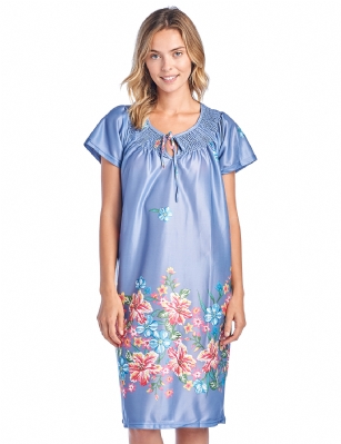Casual Nights Women's Round Neck Mu-Mu Housecoat Lounger - Denim - You'll love slipping into this Slip over Muumuu Caftan Dress From our Lounge Dresses & MuuMuus collection, designed in Floral silky satin fabric with a relaxed Fit. This Duster Features Short Sleeves, Smocked Detail, and Tie neck closure. This Ultra-Lightweight fabric House Dress will keep you comfortable and stylish to wear it around the house or to sleep in.