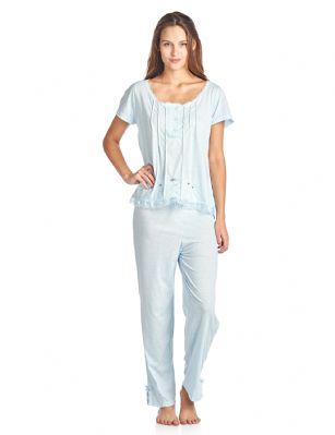 Casual Nights Women's Short Sleeve Dot Print Pajama Sleepwear Set - Blue - Use provided size chart to determine the size that will fit you best, if your measurements fall between two sizes we recommend ordering a larger size as most people prefer their sleepwear a little looser. Top Length 24", Sleep Pants Inseam 26"Medium: Measures US Size 0–2, Chests/Bust 31”-33" Large: Measures US Size 4-6, Chests/Bust 33”-35"X-Large: Measures US Size 8-10, Chests/Bust 36”-37" XX-Large: Measures US Size 10-12, Chests/Bust 37”-38" 1X: Measures US Size 0-0, Chests/Bust 00”-00"2X: Measures US Size 0-0, Chests/Bust 00”-00"3X: Measures US Size 0-0, Chests/Bust 00”-00"4X: Measures US Size 0-0, Chests/Bust 00”-00" Soft and lightweight feminine Knitted Short sleeve Pjs top With Long pants Pajamas 2-piece Sleep Set from Casual Nights in cute printed polka dot patterns, Embroidered Flowers, lace ruffled Trim detail, Long pants with hidden elastic rubber waist and drawstring for extra added comfort, 26” inseam length, Round Neck Shirt Features; Short Sleeves, 4 Button top closure, sleep top measures 24” length. This is a perfect sleep set to add to your sleepwear lounge collection, Beautiful enough for special occasions, yet comfortable enough for every day.